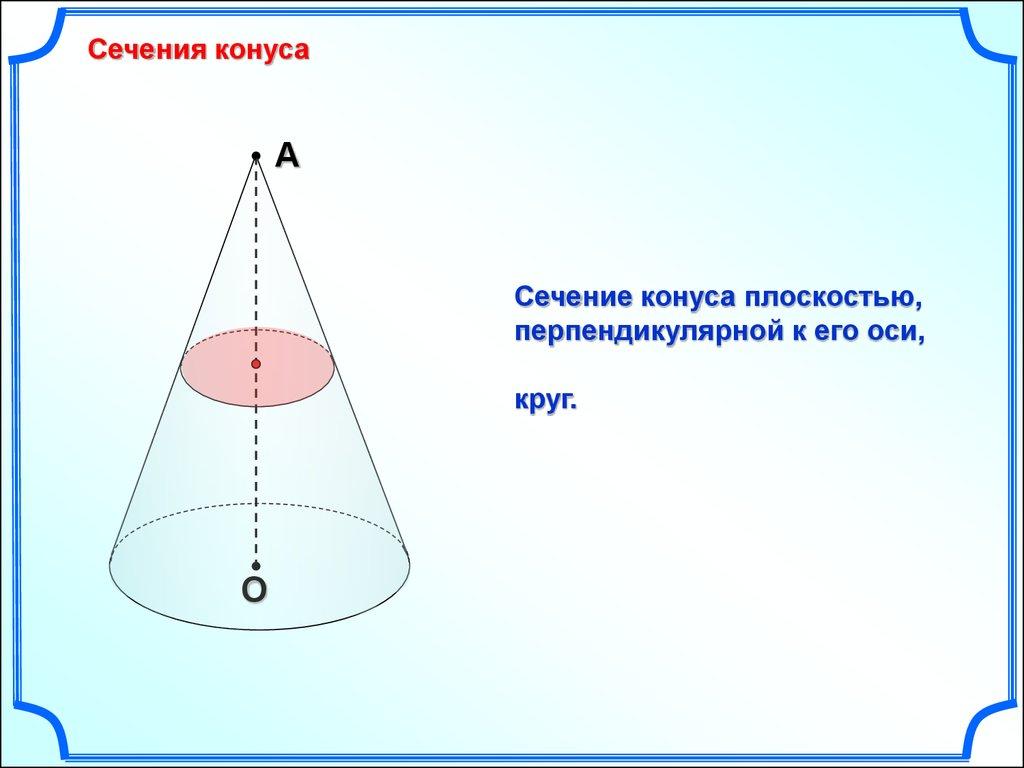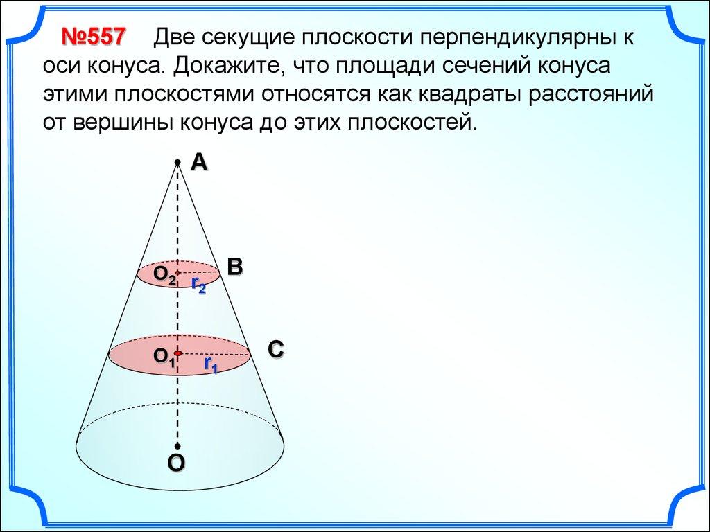 №557 Две секущие плоскости перпендикулярны коси конуса. Докажите, что площади сечений конуса
