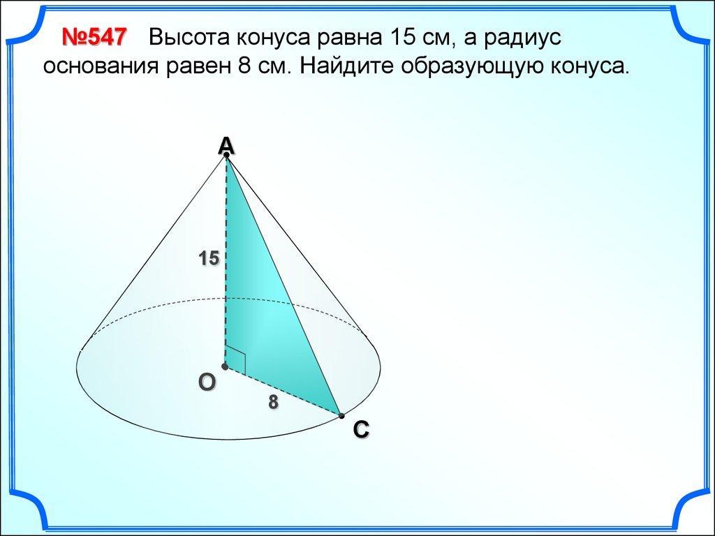 №547 Высота конуса равна 15 см, а радиусоснования равен 8 см. Найдите образующую конуса.