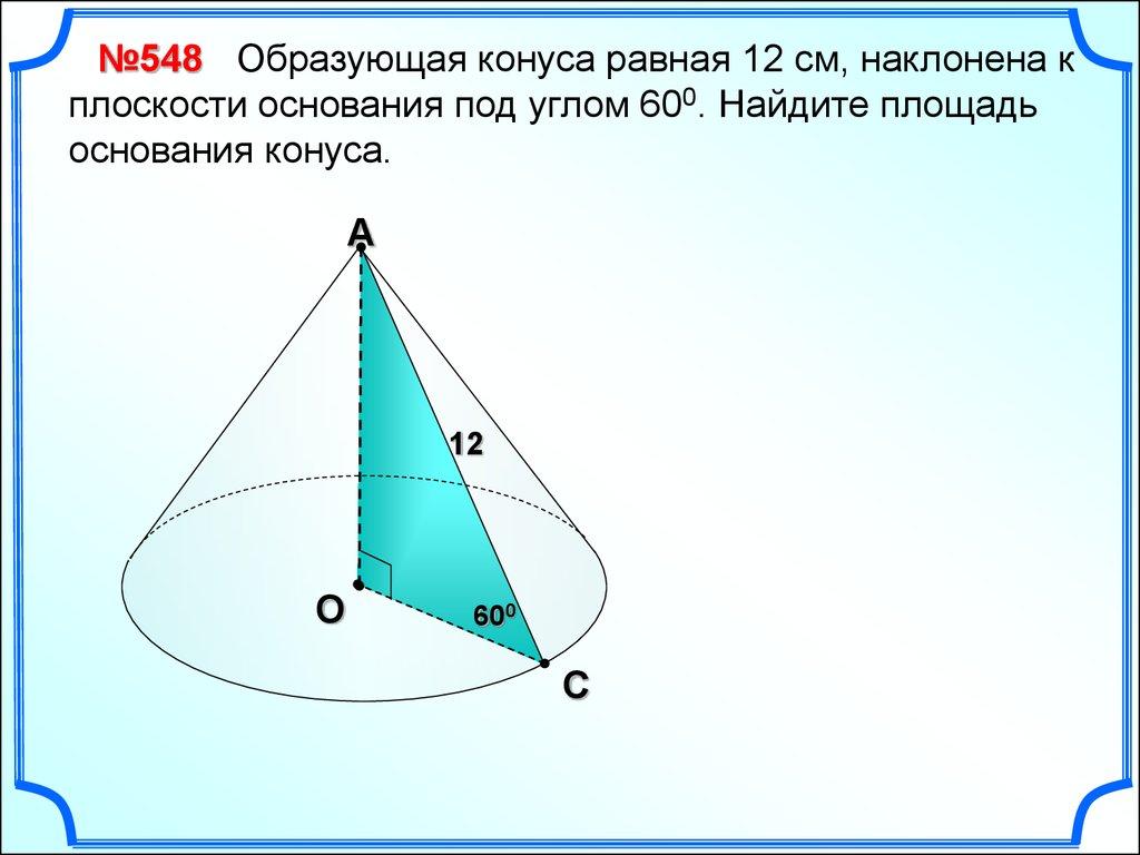 №548 Образующая конуса равная 12 см, наклонена кплоскости основания под углом 600. Найдите площадь
