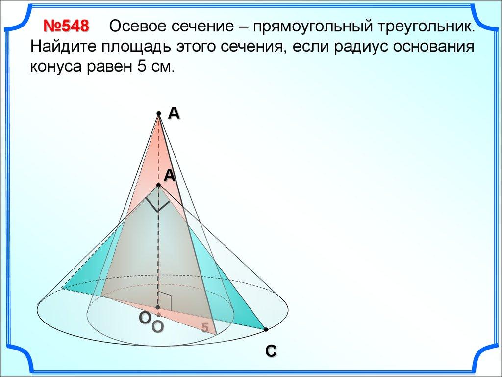 №548 Осевое сечение – прямоугольный треугольник.Найдите площадь этого сечения, если радиус основания