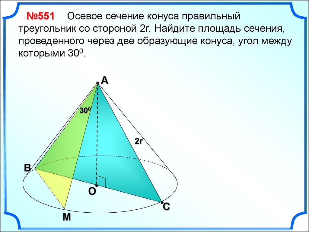 №551 Осевое сечение конуса правильныйтреугольник со стороной 2r. Найдите площадь сечения,