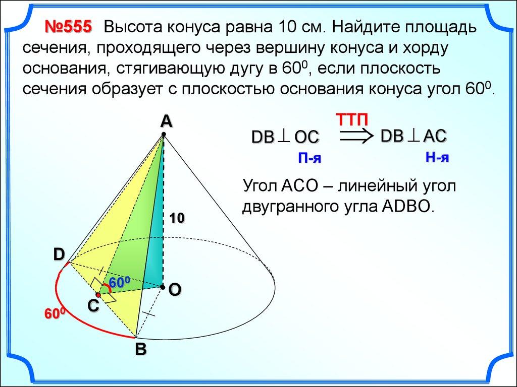 №555 Высота конуса равна 10 см. Найдите площадьсечения, проходящего через вершину конуса и хорду