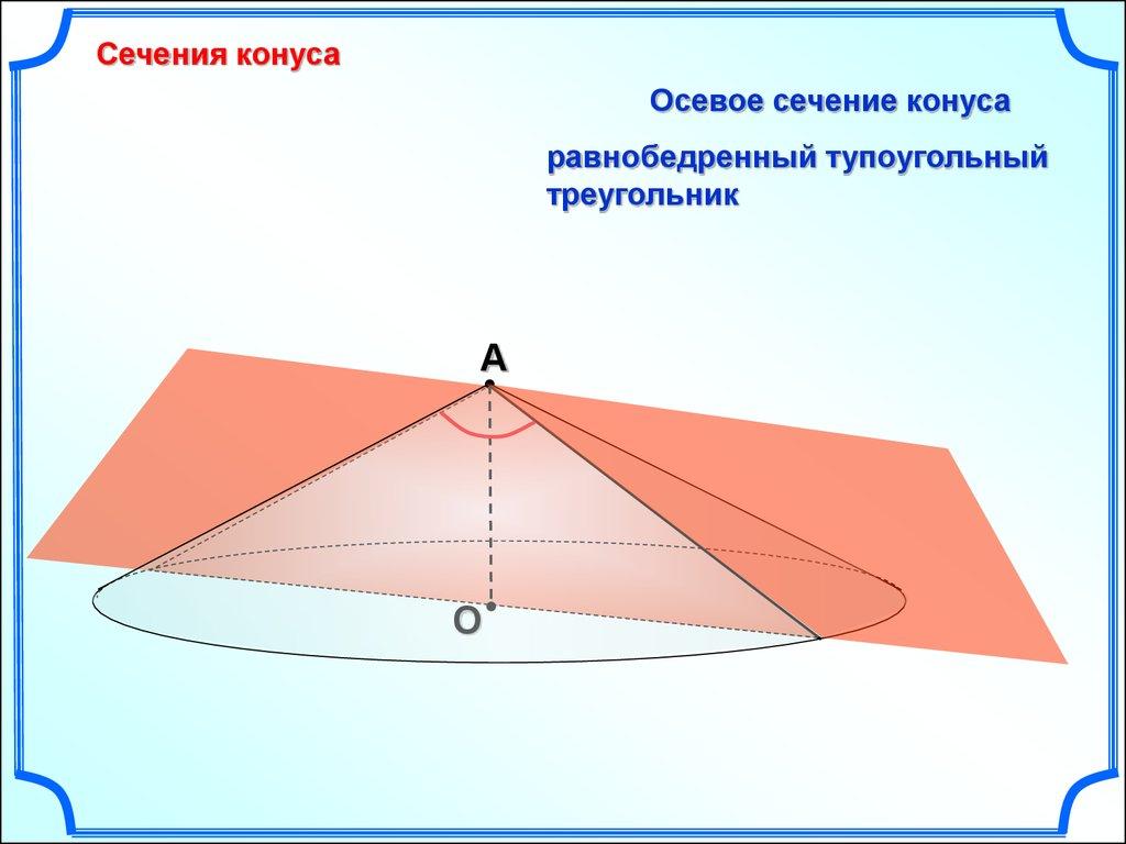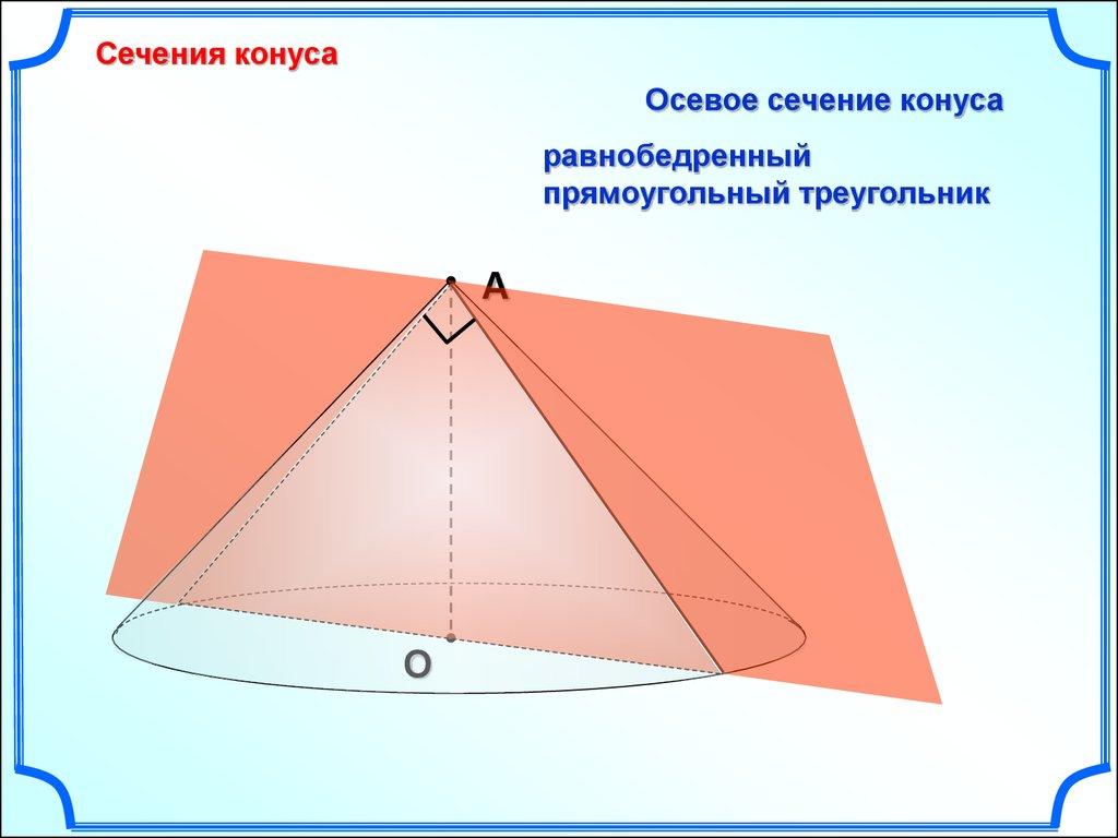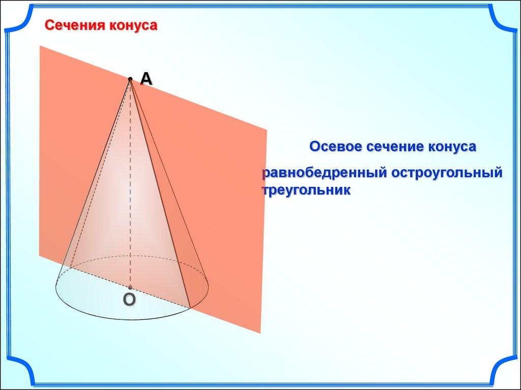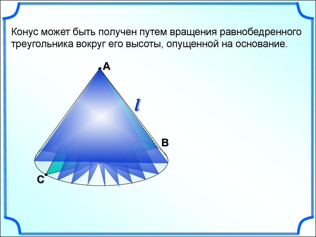Конус может быть получен путем вращения равнобедренноготреугольника вокруг его высоты, опущенной на основание.