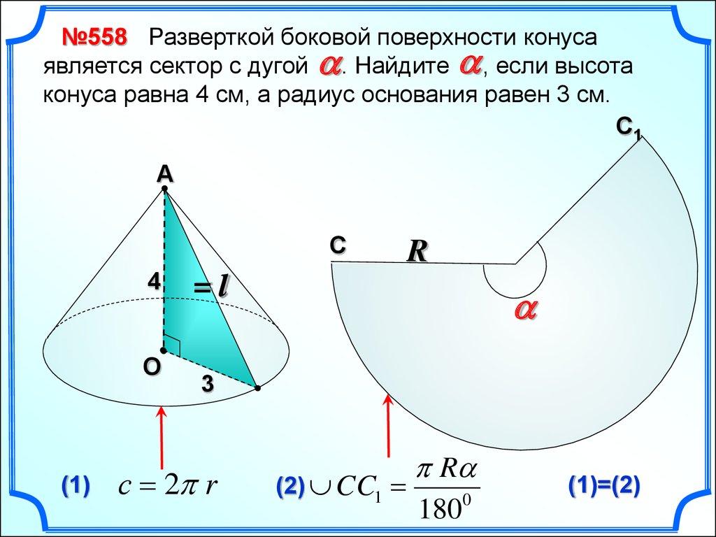 №558 Разверткой боковой поверхности конусаявляется сектор с дугой . Найдите , если высота