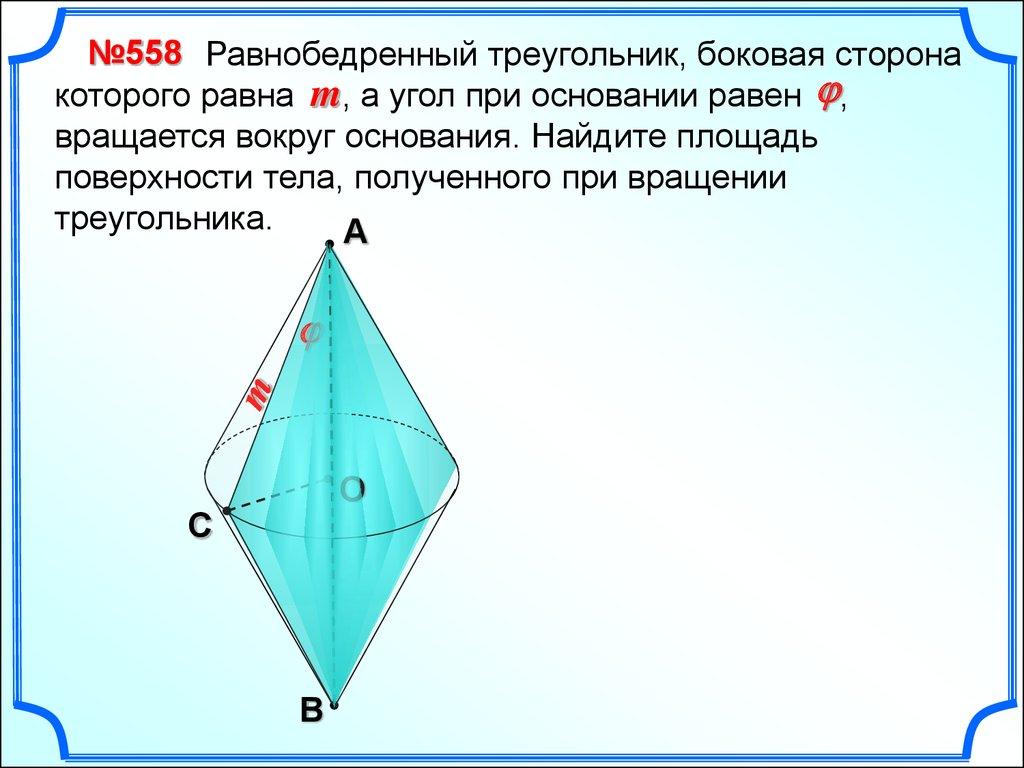 №558 Равнобедренный треугольник, боковая сторонакоторого равна m, а угол при основании равен j,