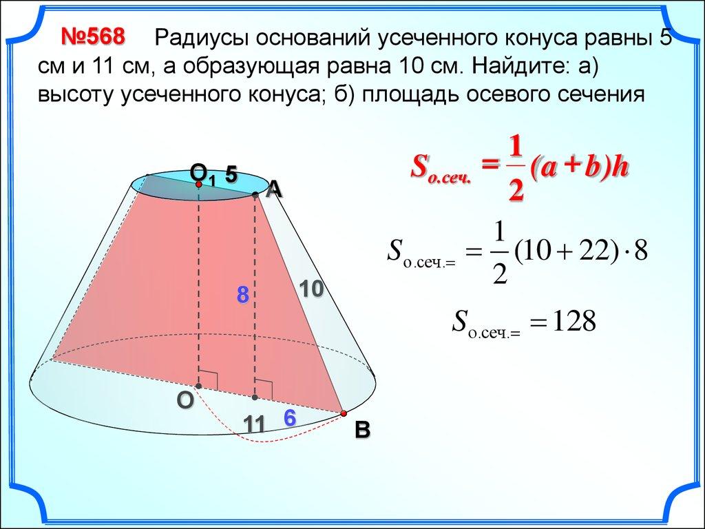№568 Радиусы оснований усеченного конуса равны 5см и 11 см, а образующая равна 10 см. Найдите: а)