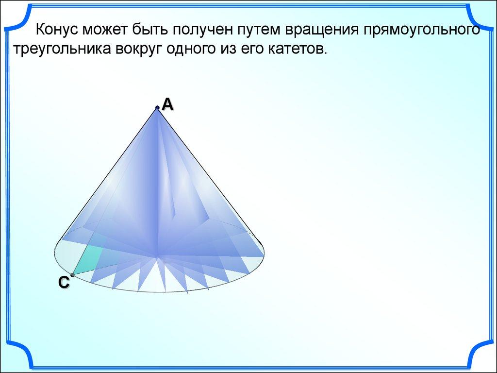 Конус может быть получен путем вращения прямоугольноготреугольника вокруг одного из его катетов.