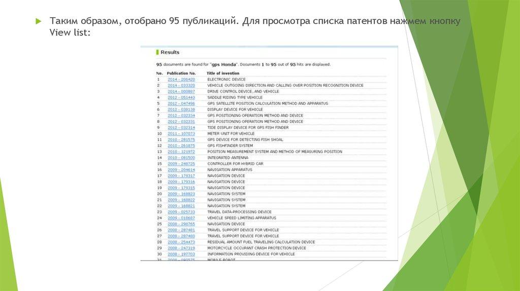 Таким образом, отобрано 95 публикаций. Для просмотра списка патентов нажмем кнопкуView list: