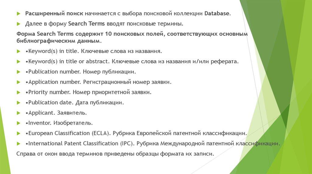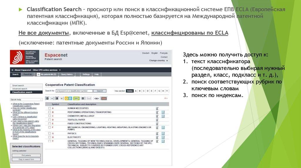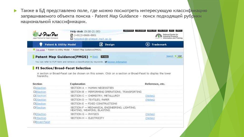 Также в БД представлено поле, где можно посмотреть интересующую классификациюзапрашиваемого объекта поиска - Patent Map Guidance – поиск подходящей рубрики