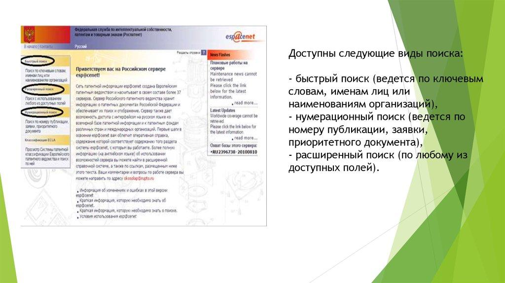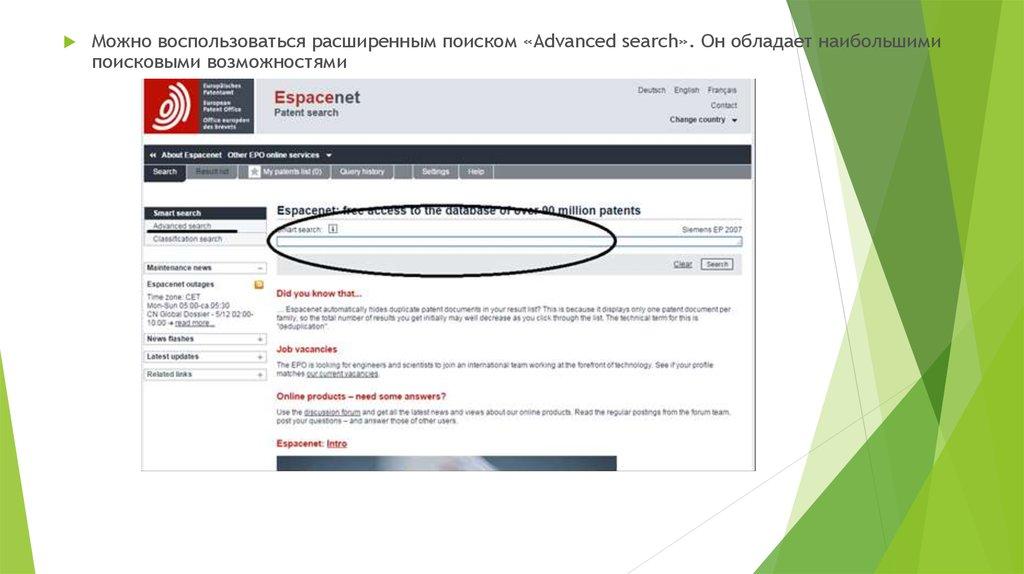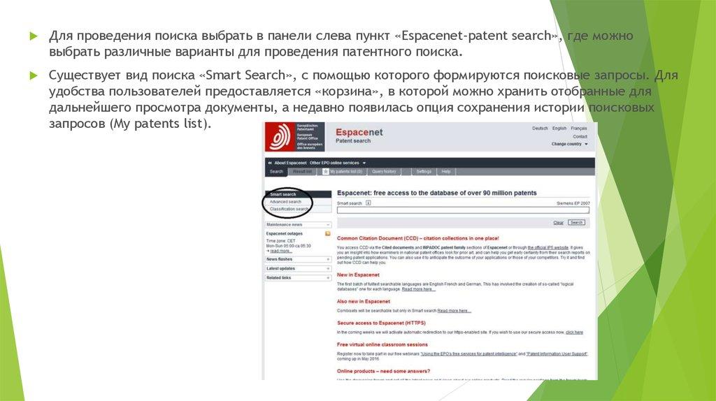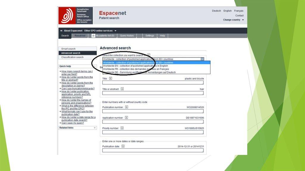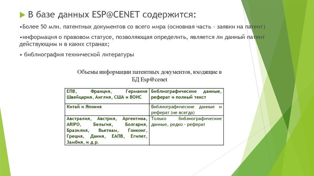 В базе данных ESP@CENET содержится:•Более 50 млн. патентных документов со всего мира (основная часть - заявки на патент)