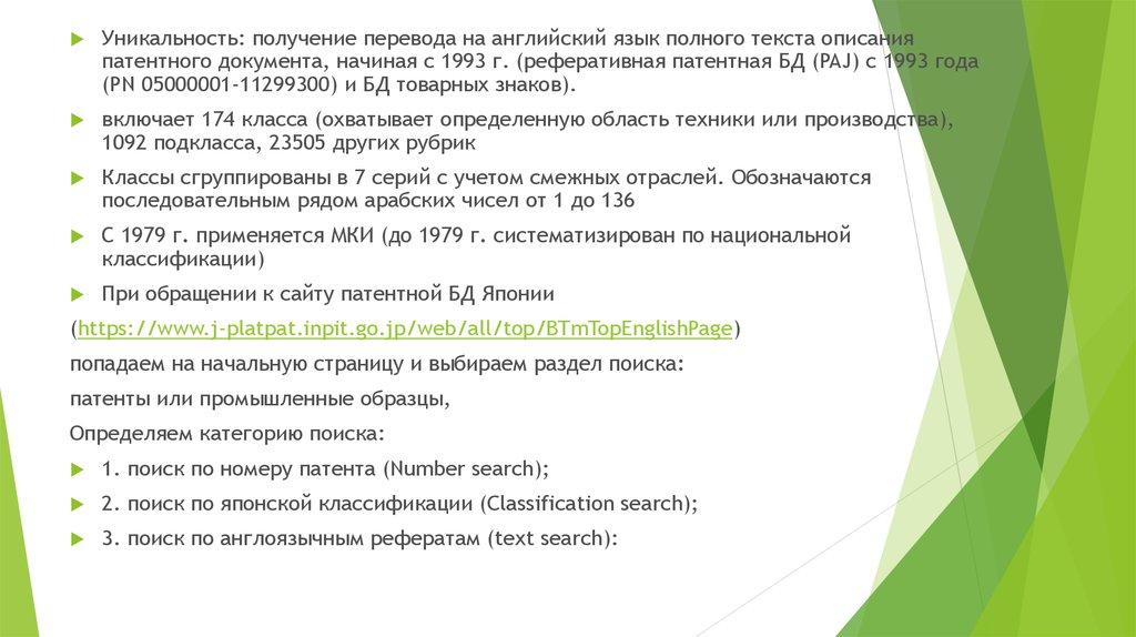Уникальность: получение перевода на английский язык полного текста описанияпатентного документа, начиная с 1993 г. (реферативная патентная БД (PAJ) с 1993 года