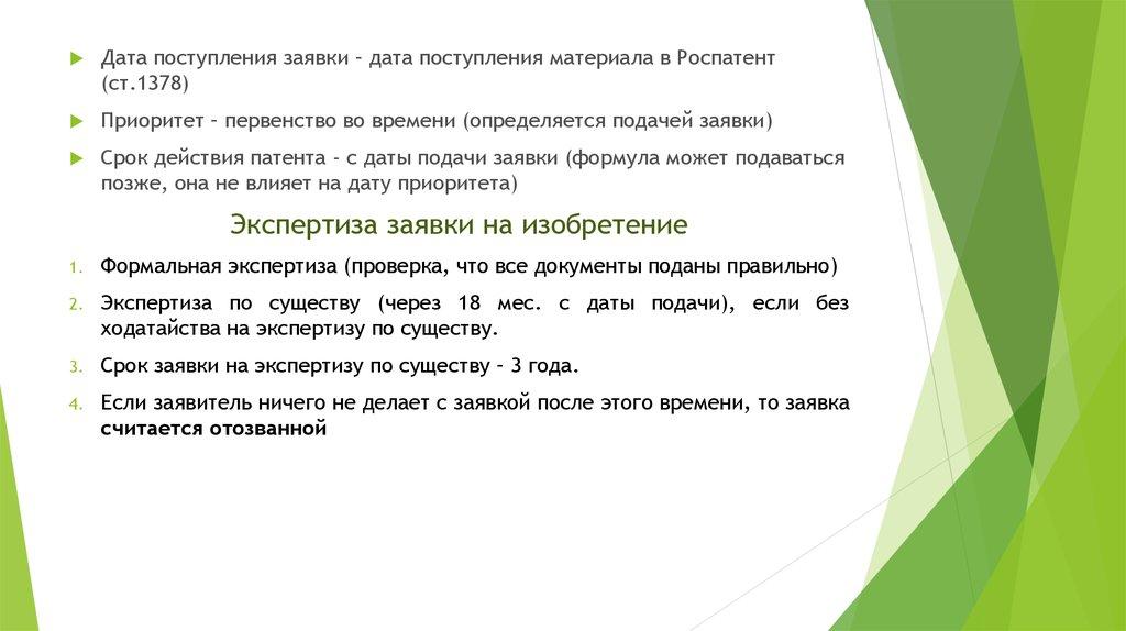 Дата поступления заявки – дата поступления материала в Роспатент(ст.1378)