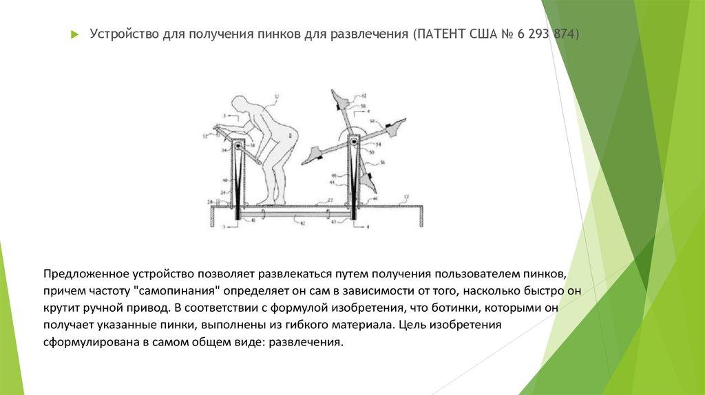 Устройство для получения пинков для развлечения (ПАТЕНТ США № 6 293 874)Предложенное устройство позволяет развлекаться путем получения пользователем пинков,