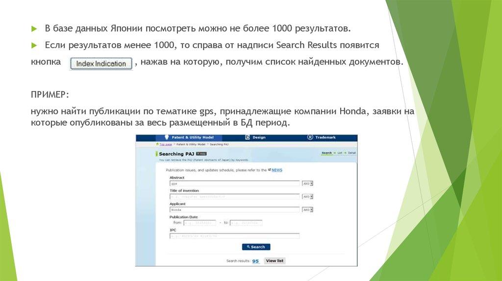В базе данных Японии посмотреть можно не более 1000 результатов.Если результатов менее 1000, то справа от надписи Search Results появится