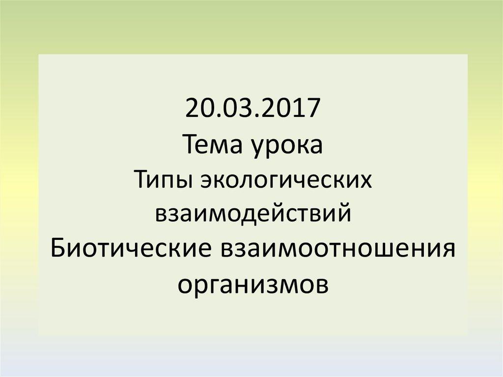 2. 20.03.2017 Тема урока Типы экологических взаимодействий Биотические взаимоотношения организмов