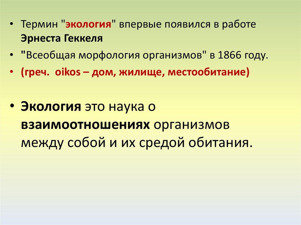 • Термин "экология" впервые появился в работеЭрнеста Геккеля