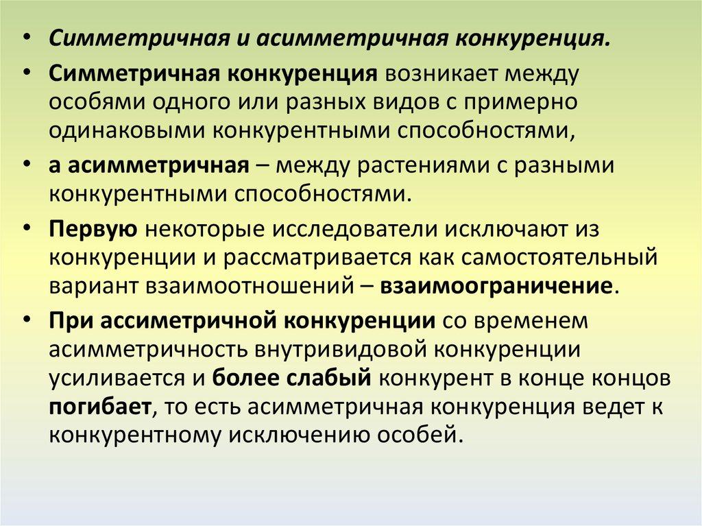 • Симметричная и асимметричная конкуренция.• Симметричная конкуренция возникает между