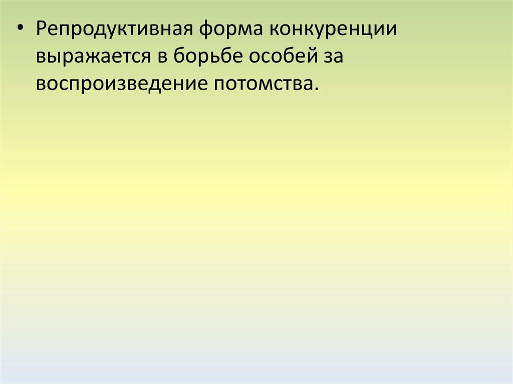 • Репродуктивная форма конкуренциивыражается в борьбе особей за