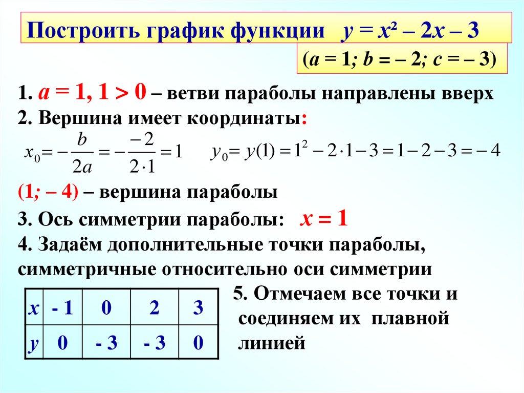 Построить график функции у = х² – 2х – 3(а = 1; b = – 2; с = – 3)