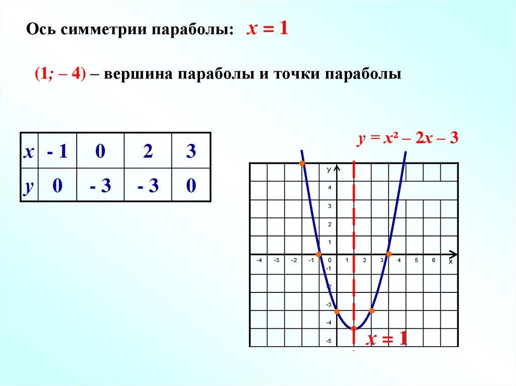 Ось симметрии параболы: х = 1(1; – 4) – вершина параболы и точки параболы