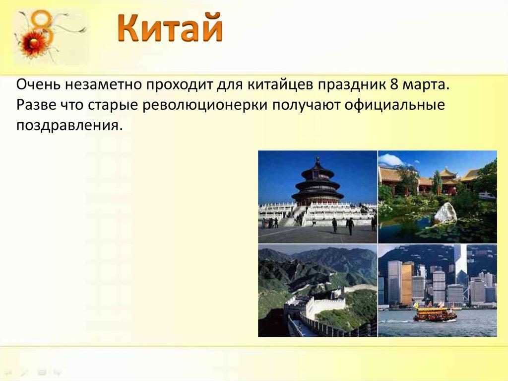 Очень незаметно проходит для китайцев праздник 8 марта.Разве что старые революционерки получают официальные