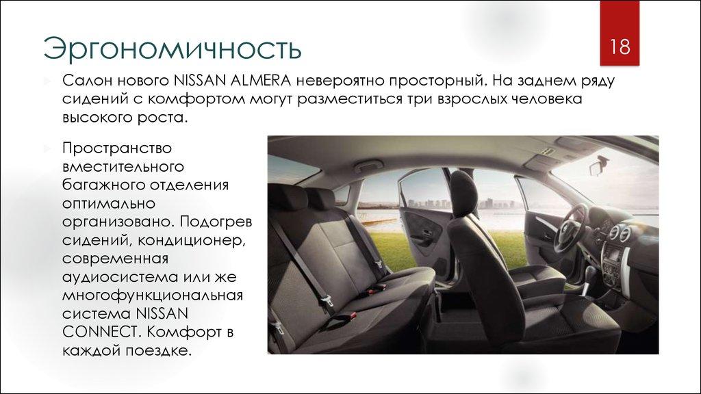18Салон нового NISSAN ALMERA невероятно просторный. На заднем ряду