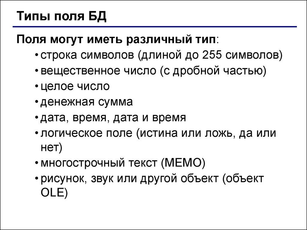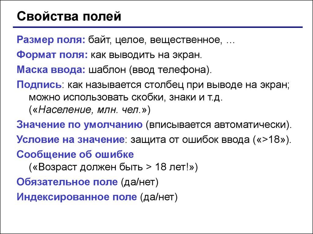 Свойства полейРазмер поля: байт, целое, вещественное, …