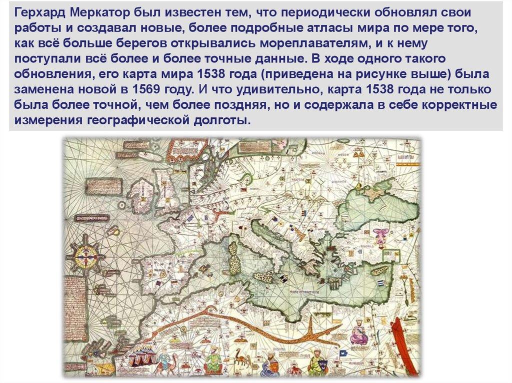 Герхард Меркатор был известен тем, что периодически обновлял своиработы и создавал новые, более подробные атласы мира по мере того,