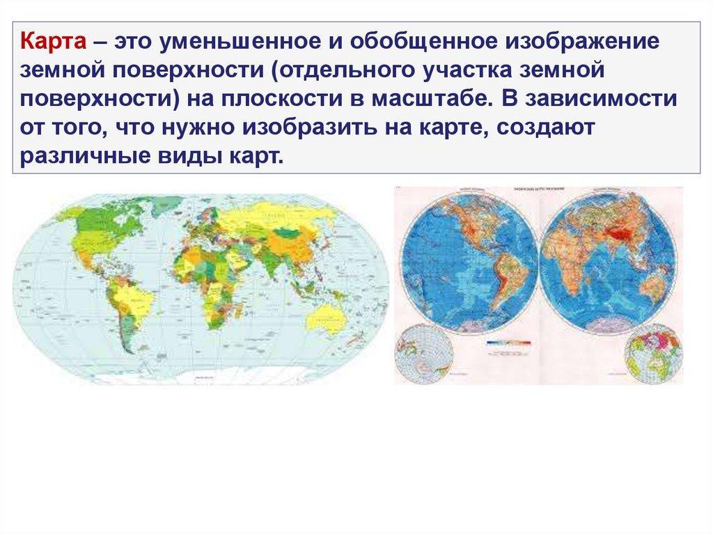 Карта – это уменьшенное и обобщенное изображениеземной поверхности (отдельного участка земной