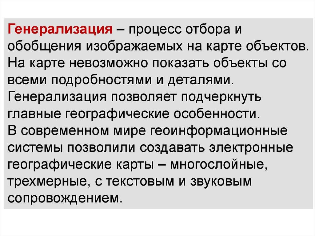 Генерализация – процесс отбора иобобщения изображаемых на карте объектов.