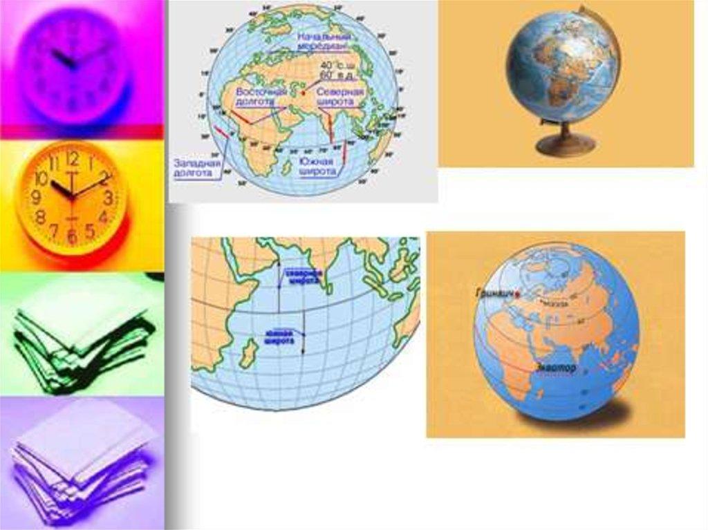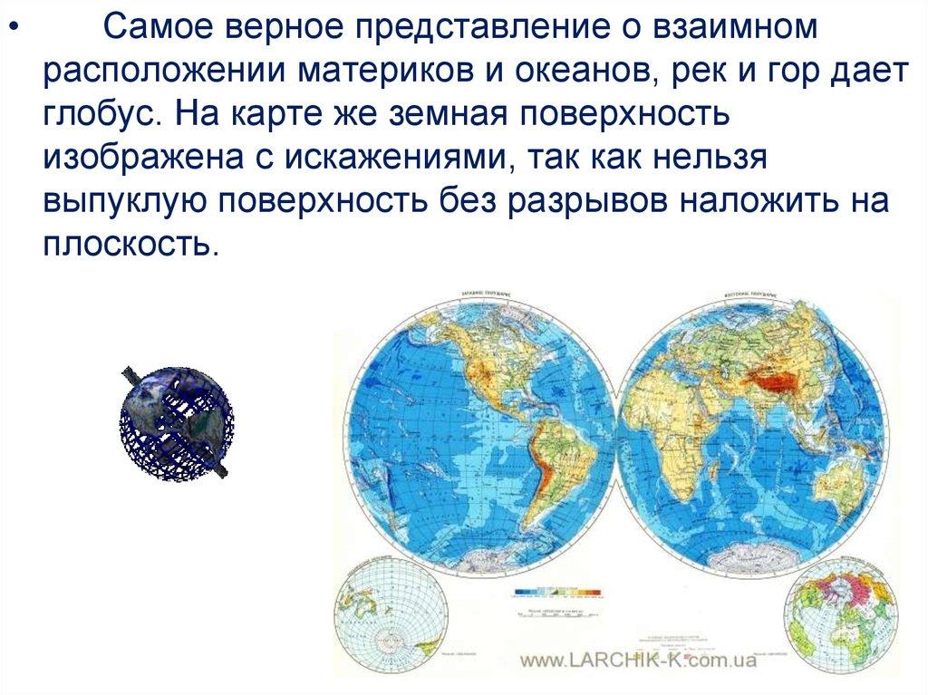 расположении материков и океанов, рек и гор дает