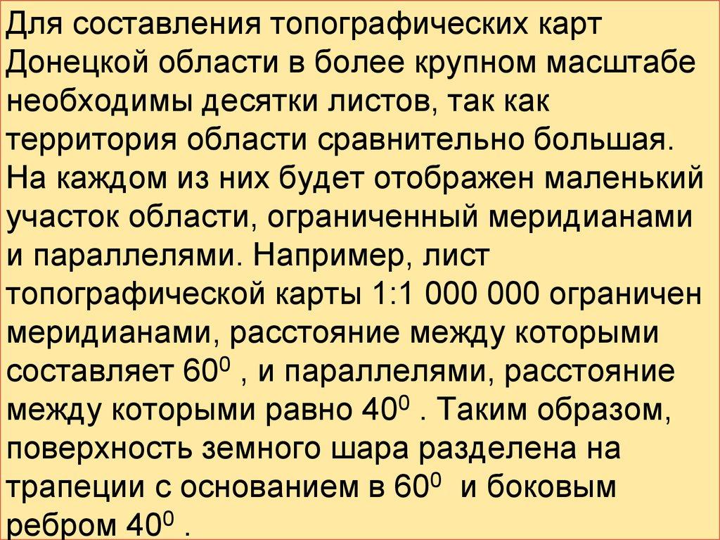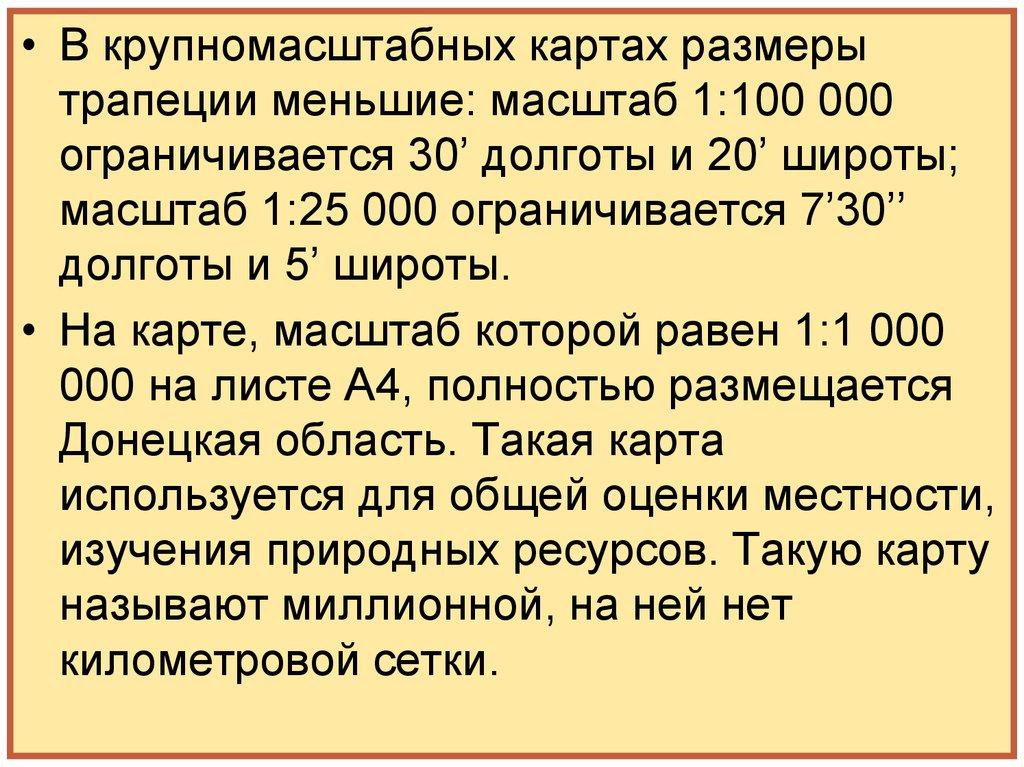 • В крупномасштабных картах размерытрапеции меньшие: масштаб 1:100 000