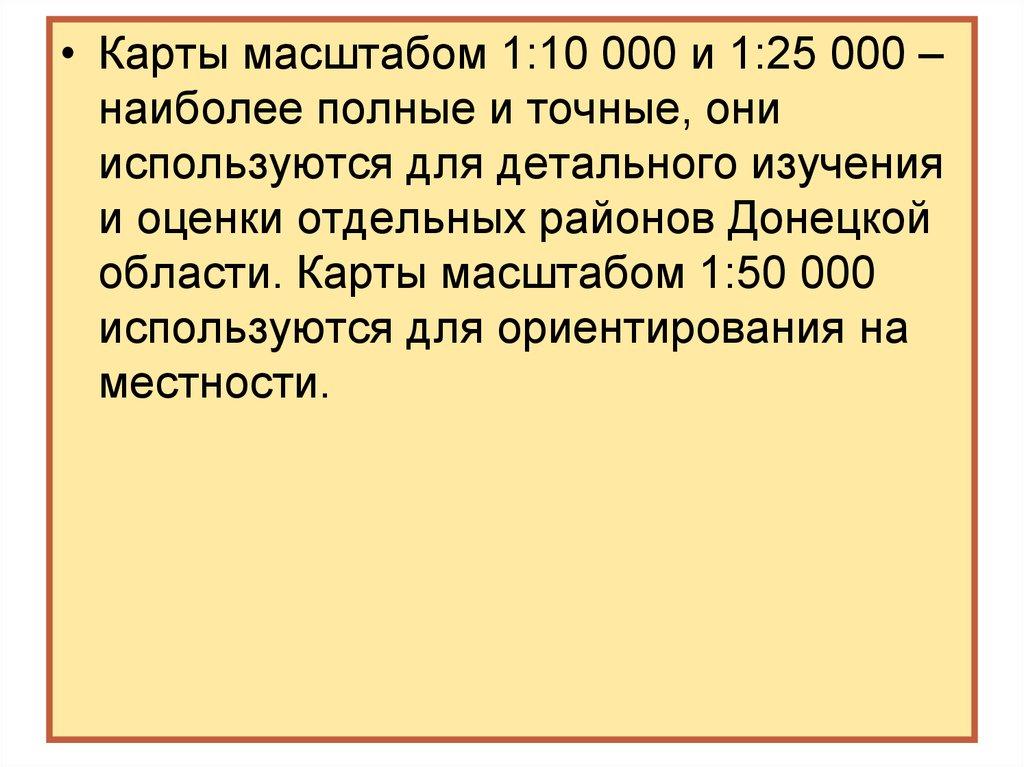 • Карты масштабом 1:10 000 и 1:25 000 –наиболее полные и точные, они