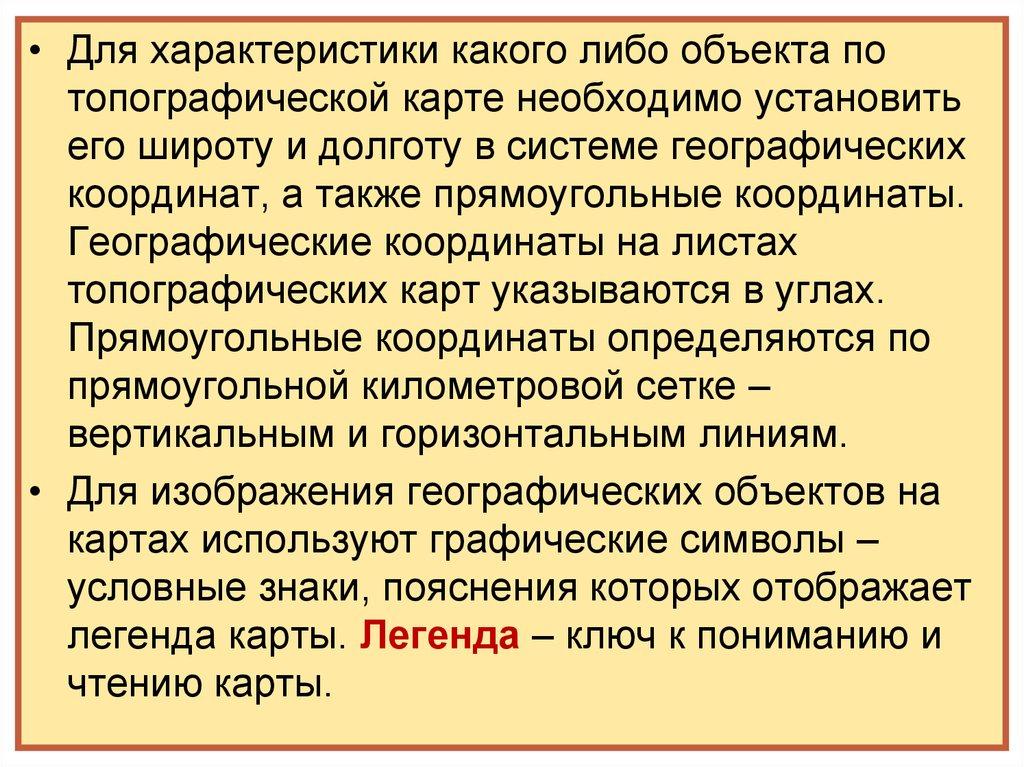 • Для характеристики какого либо объекта потопографической карте необходимо установить