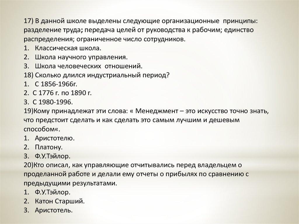 17) В данной школе выделены следующие организационные принципы:разделение труда; передача целей от руководства к рабочим; единство