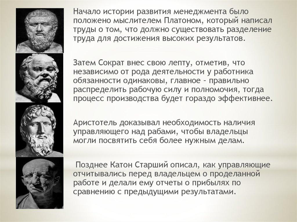 Начало истории развития менеджмента былоположено мыслителем Платоном, который написал
