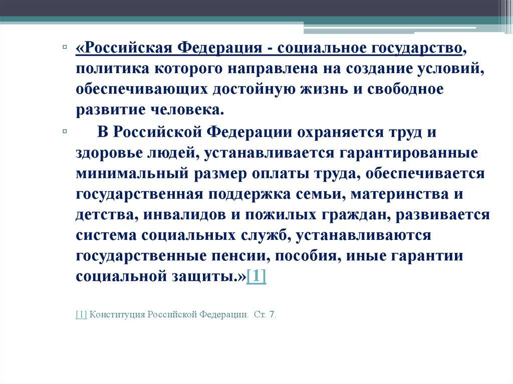 ▫ «Российская Федерация - социальное государство,политика которого направлена на создание условий,