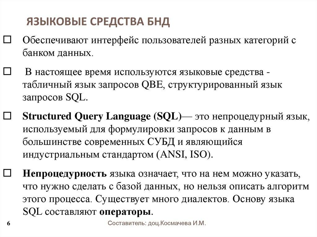 ЯЗЫКОВЫЕ СРЕДСТВА БНДОбеспечивают интерфейс пользователей разных категорий с