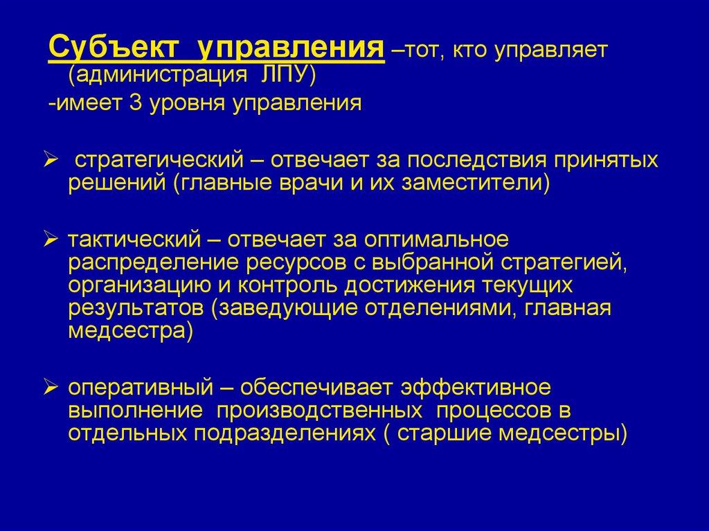 Субъект управления –тот, кто управляет(администрация ЛПУ)