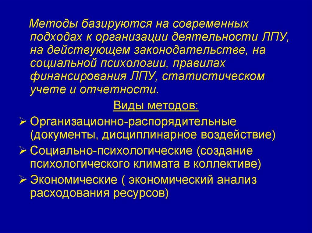 Методы базируются на современныхподходах к организации деятельности ЛПУ,