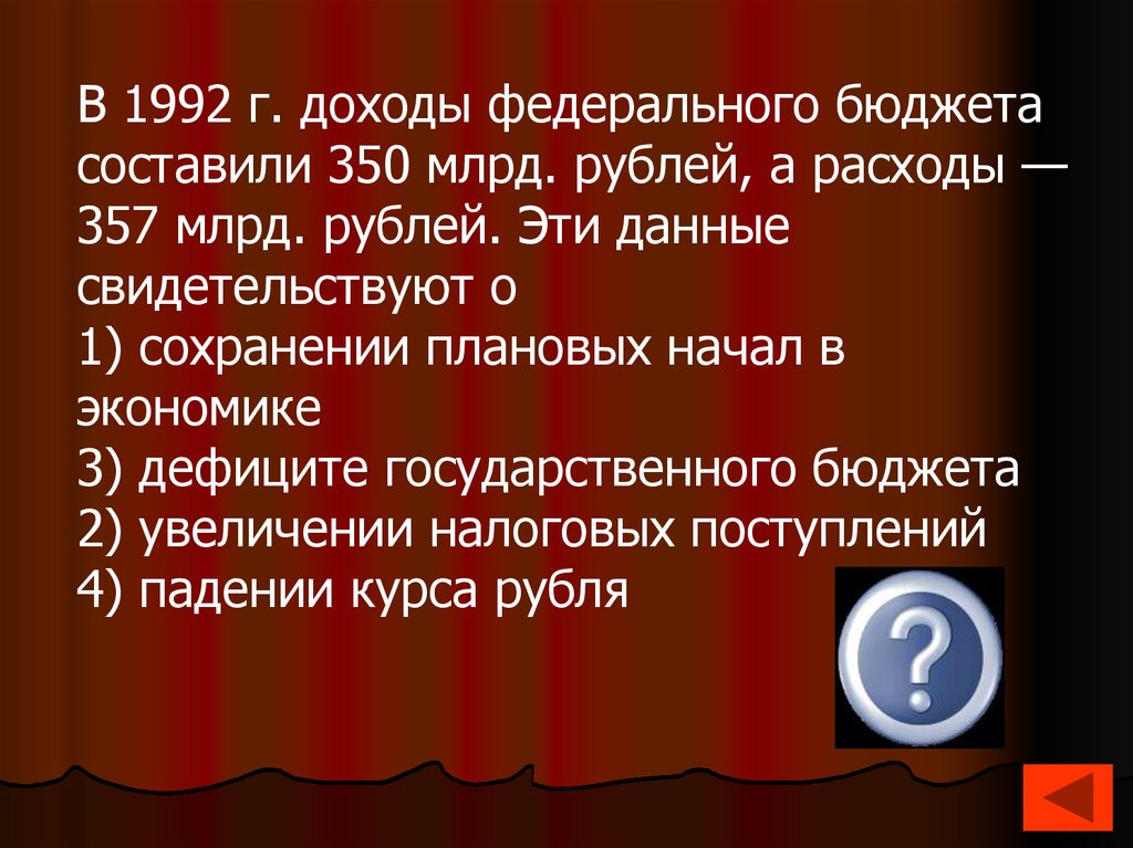 В 1992 г. доходы федерального бюджетасоставили 350 млрд. рублей, а расходы —