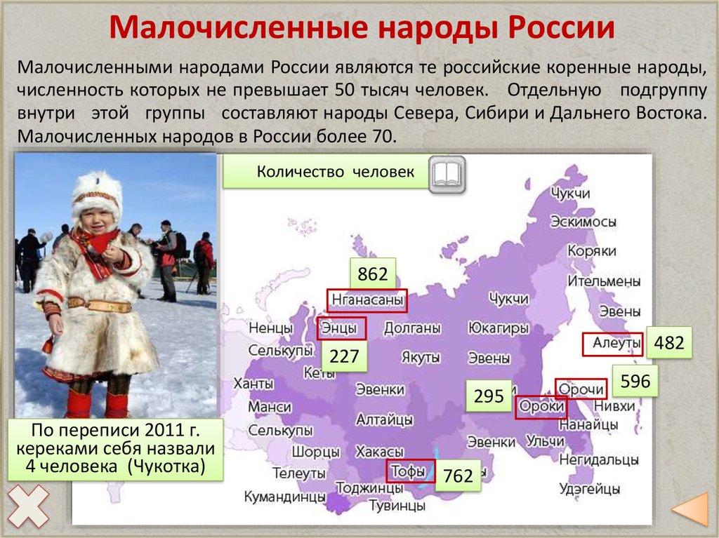 Малочисленные народы РоссииМалочисленными народами России являются те российские коренные народы,