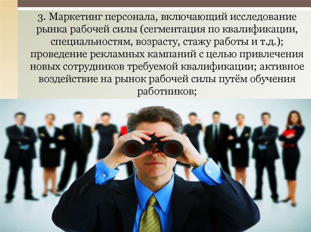 3. Маркетинг персонала, включающий исследованиерынка рабочей силы (сегментация по квалификации,