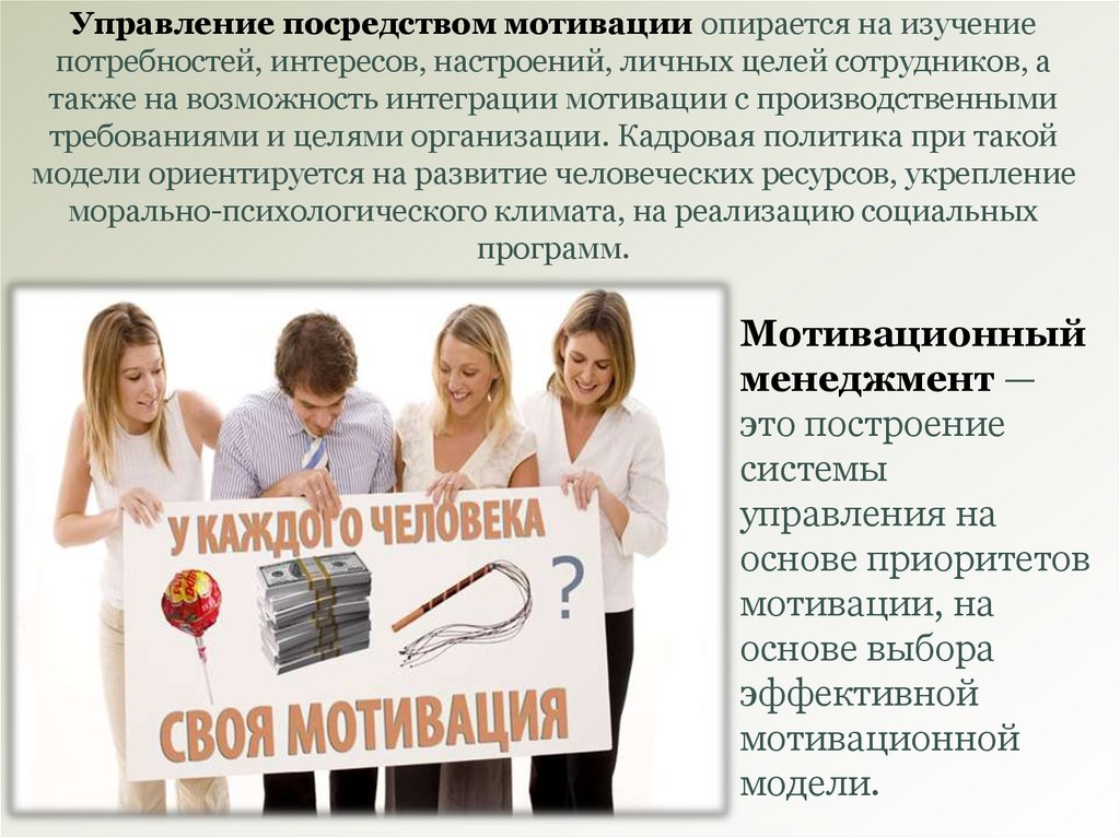 Управление посредством мотивации опирается на изучениепотребностей, интересов, настроений, личных целей сотрудников, а