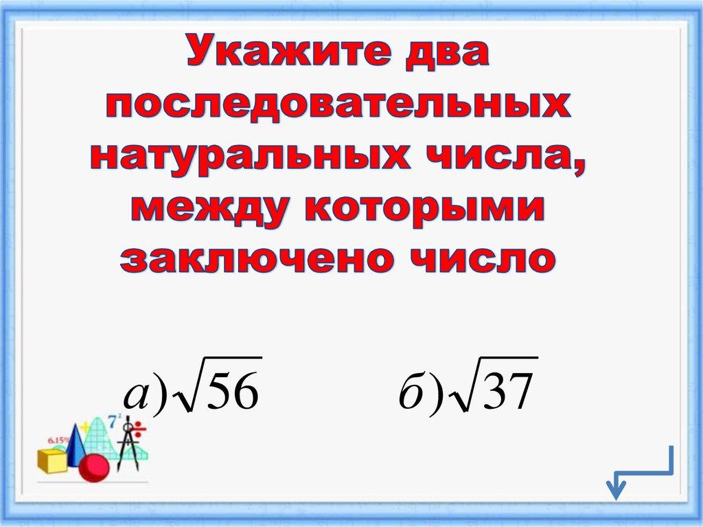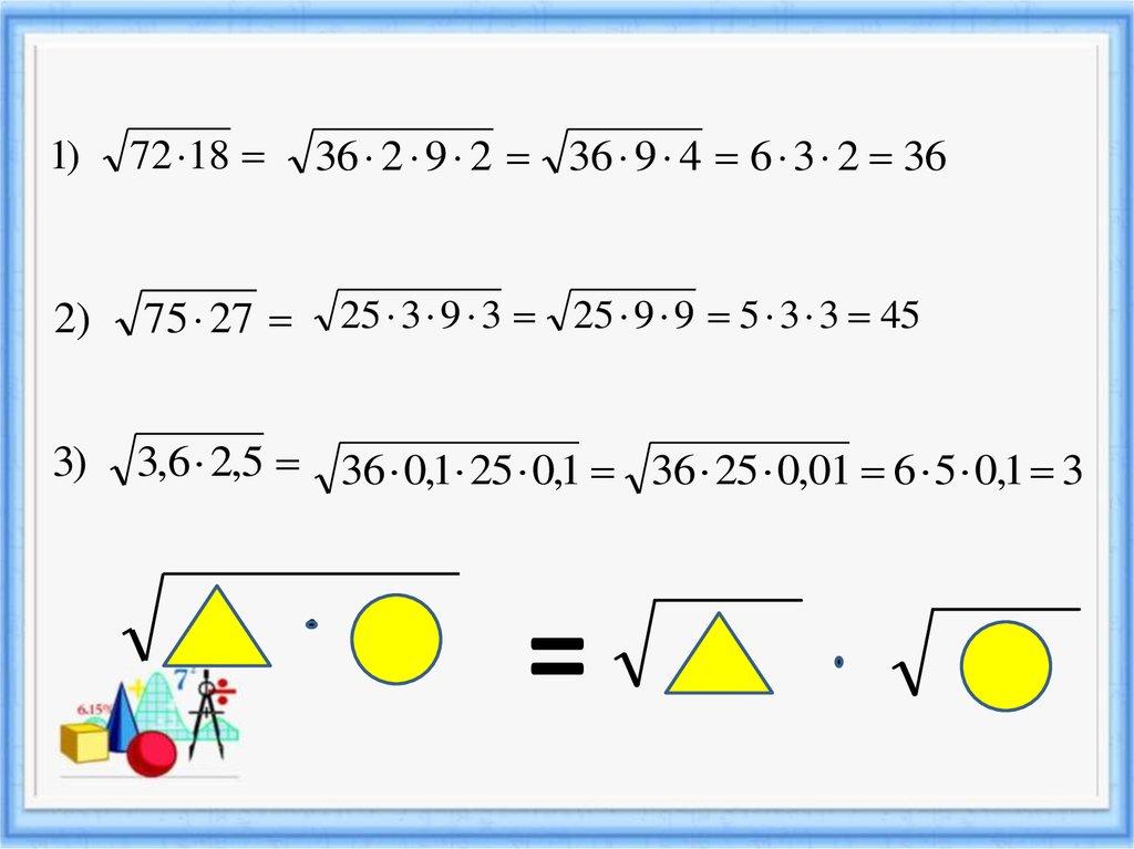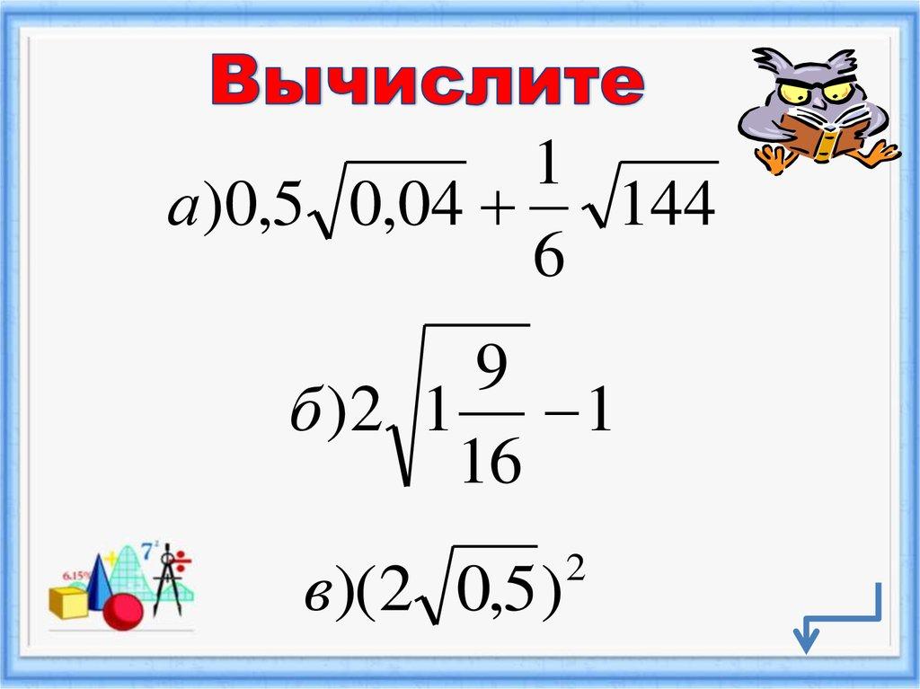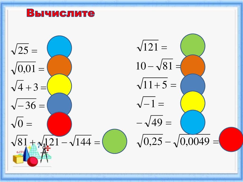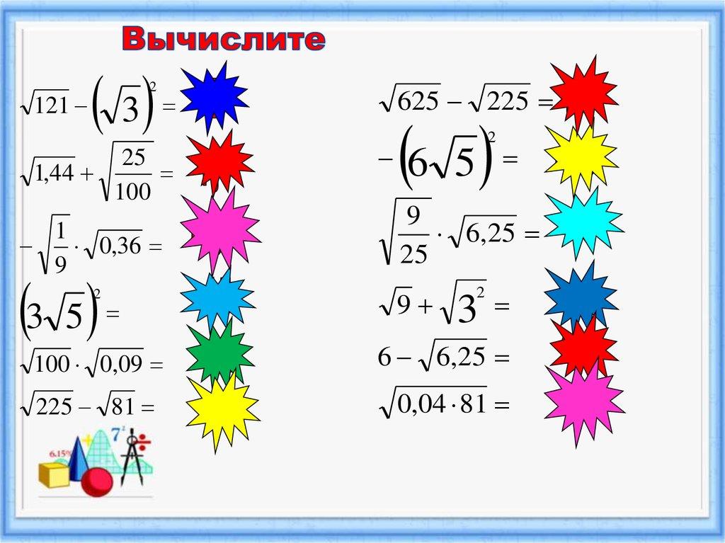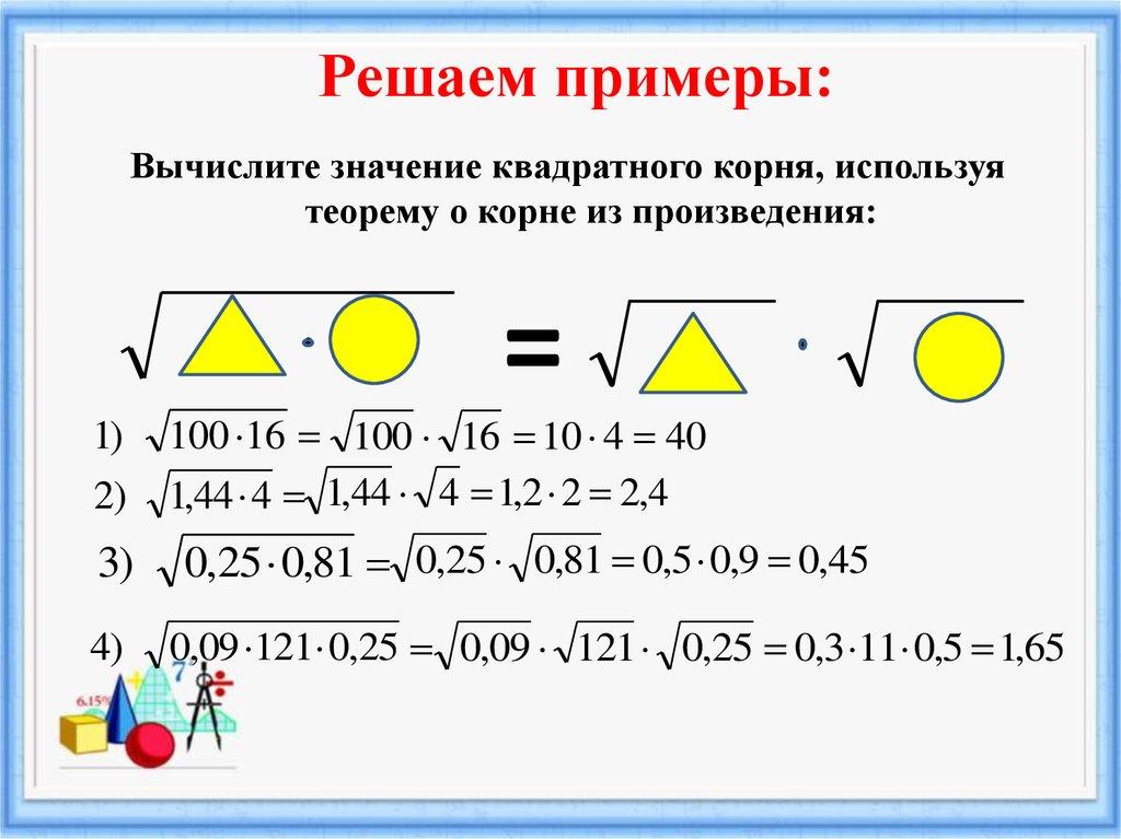 Решаем примеры:Вычислите значение квадратного корня, используя
