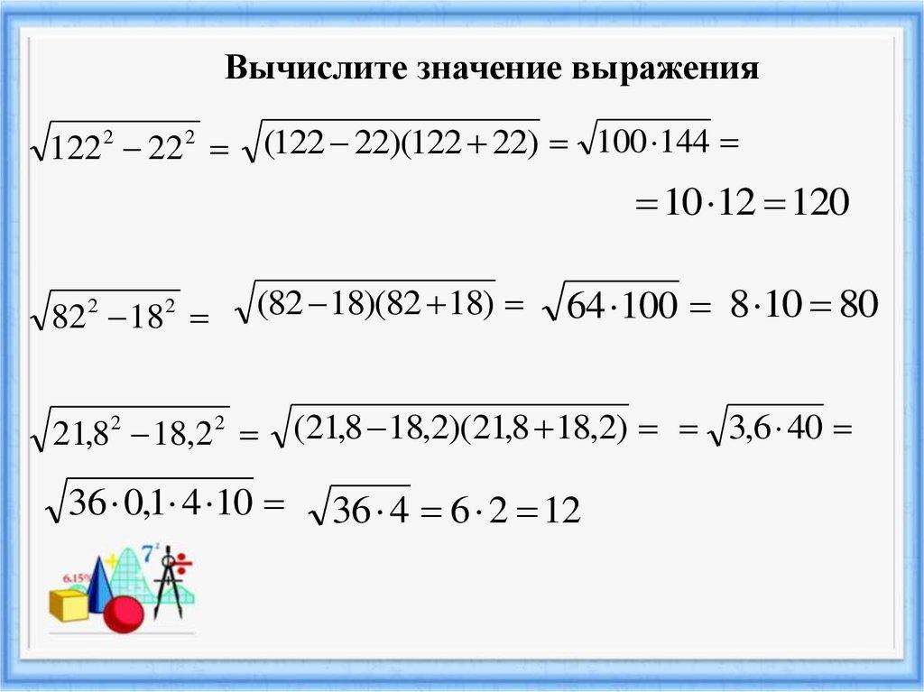 Вычислите значение выражения122 2 22 2 (122 22)(122 22) 100 144