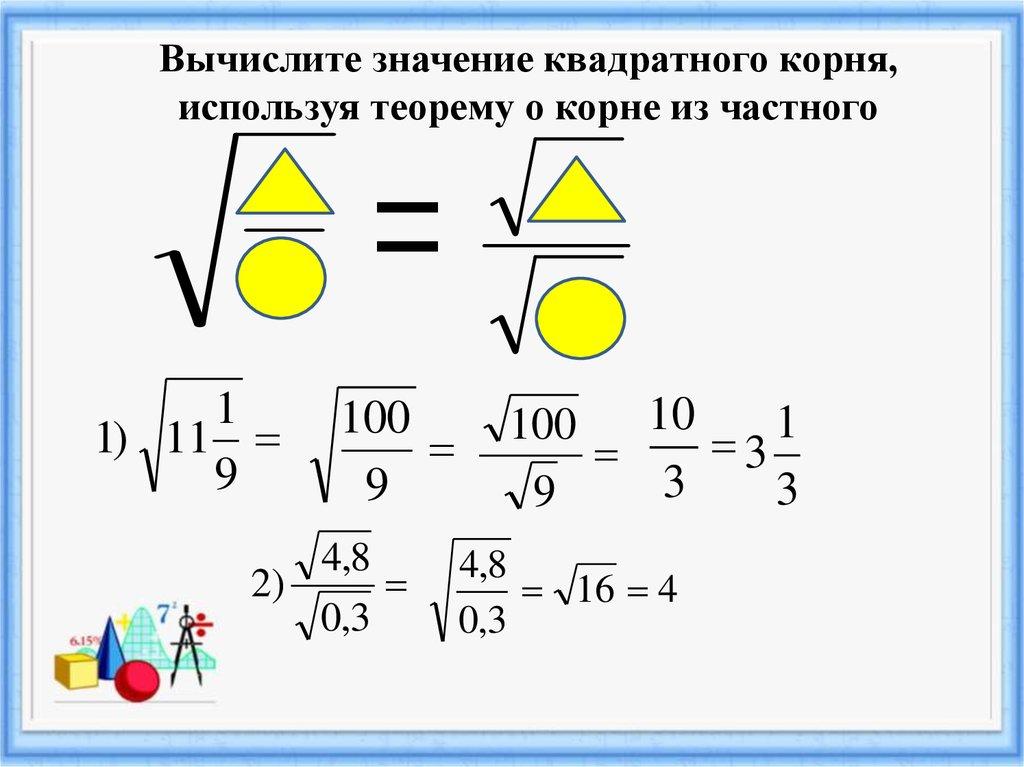 Вычислите значение квадратного корня,используя теорему о корне из частного