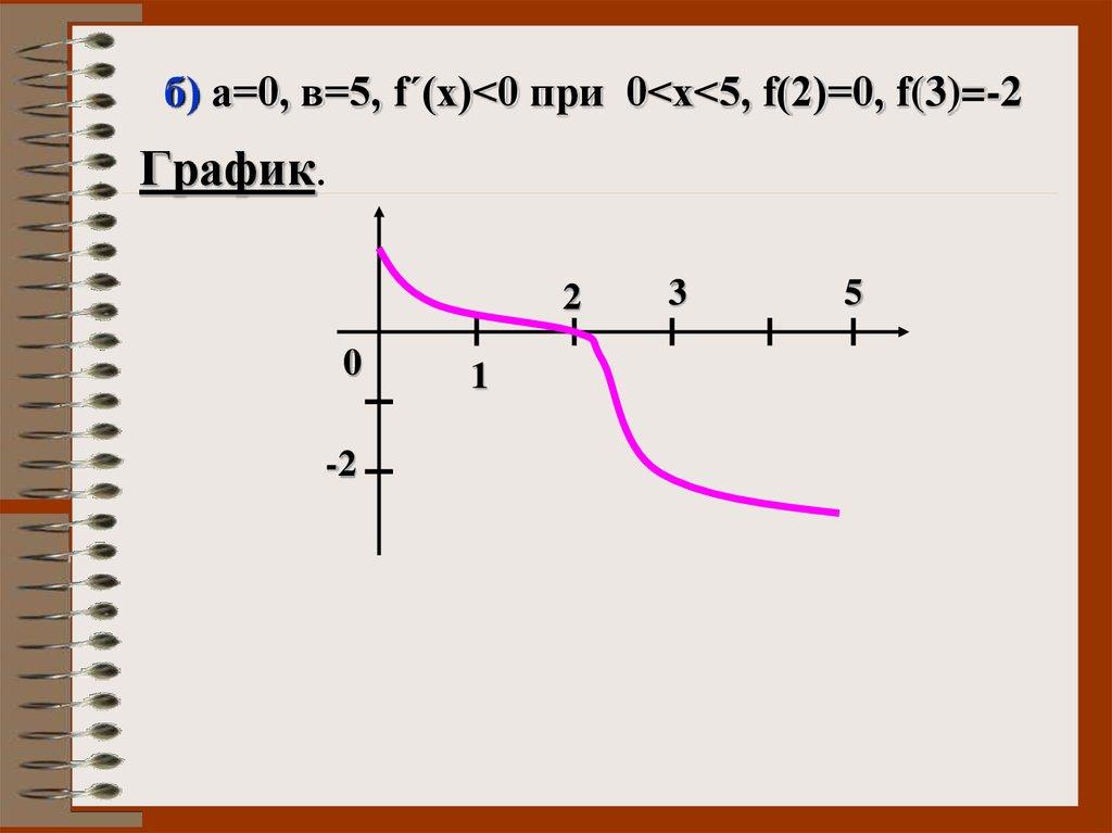 б) а=0, в=5, f΄(х)<0 при 0<х<5, f(2)=0, f(3)=-2