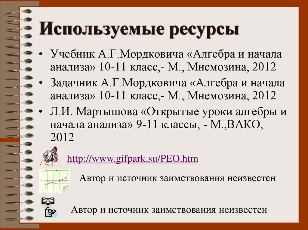 Используемые ресурсы• Учебник А.Г.Мордковича «Алгебра и начала