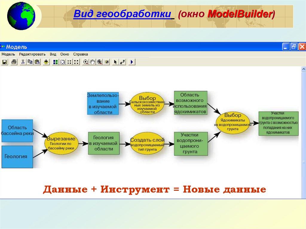 Вид геообработки (окно ModelBuilder)Данные + Инструмент = Новые данные